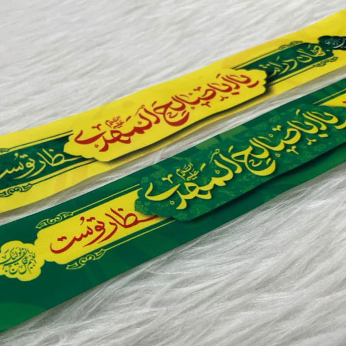- با ذکر « یا اباصالح المهدی علیه السلام» و « جهان در انتظار توست» - جنس: ساتن درجه ۱ - ابعاد: ۵*۸۰ cm - چاپ: سابلیمیشن - سایر ویژگی ها: برش خورده با لیزر و قابل شستشو با آب